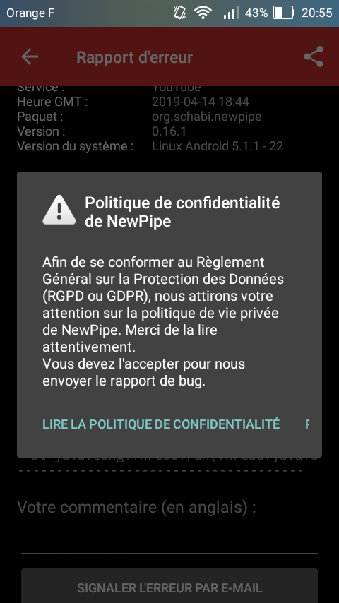 When trying to send a crash report, a pop-up appeared a few time ago asking us to read the NewPipe's Privacy Policy, and after accept it in the same pop-up window. The problem is that my screen is too small to see the "Accept" button.